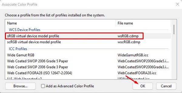 5. Selezionare ilProfilo del modello del dispositivo virtuale sRGBe fare clicOK.