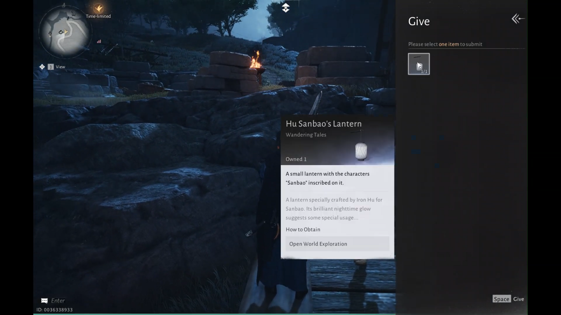 Viaggia a Masterwood Hamlet all'ora Chou per trovare Hu Sanbao, una bambina che piange per la sua Lanterna scomparsa.