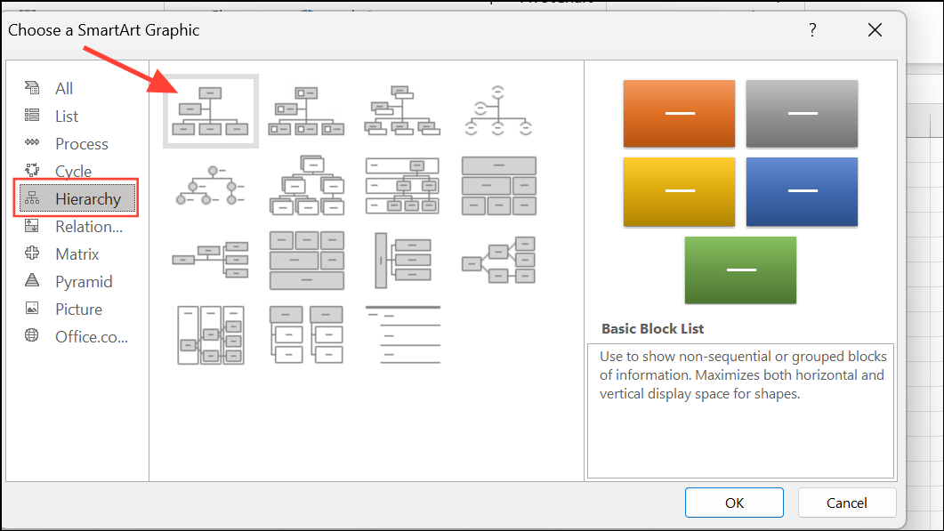 Passaggio 2:Nella raccolta SmartArt selezionare il fileHierarchycategoria dalla barra laterale a sinistra. Scegli il layout denominato "Organigramma" o uno stile gerarchico simile. ClicOKper inserire il grafico nel foglio di lavoro.