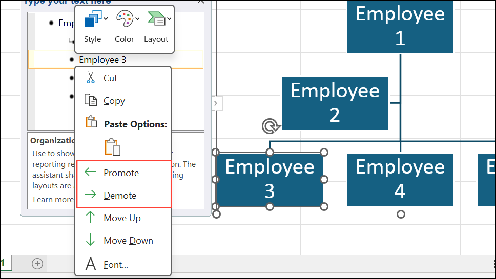Passaggio 4:Per modificare la struttura della tua organizzazione, fai clic con il pulsante destro del mouse (oCtrl+Clicksu Mac) su qualsiasi elemento dell'elenco e seleziona le opzioni per promuovere o retrocedere. In alternativa, utilizzare il+nel riquadro Testo SmartArt per inserire nuove posizioni al livello desiderato.