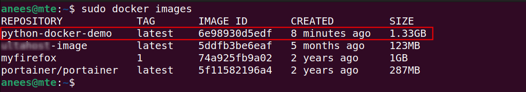 sudo docker imagesQuesto elencherà tutte le immagini disponibili sul tuo sistema, inclusa quella che hai appena creato: