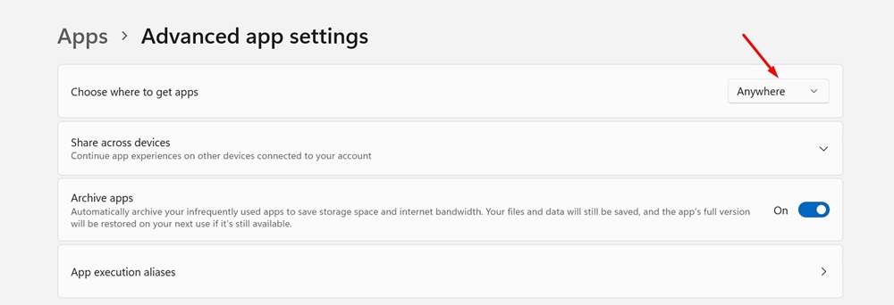 4. Fare clic sul menu a discesa accanto aScegli dove trovare le appe selezionaOvunque.