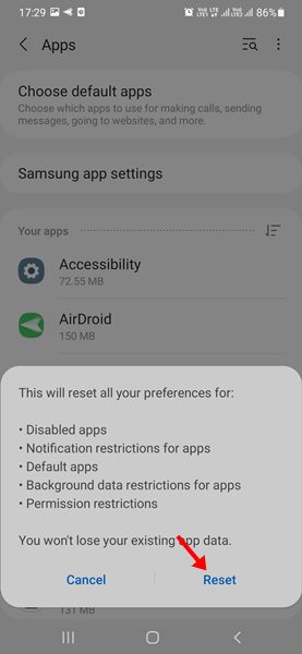 5. Verrà visualizzato un messaggio di conferma; toccare ilResetpulsante per reimpostare le preferenze dell'app.