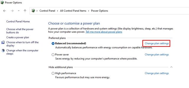 4. Selezionare ilModifica le impostazioni del pianoaccanto al piano di risparmio energia selezionato.