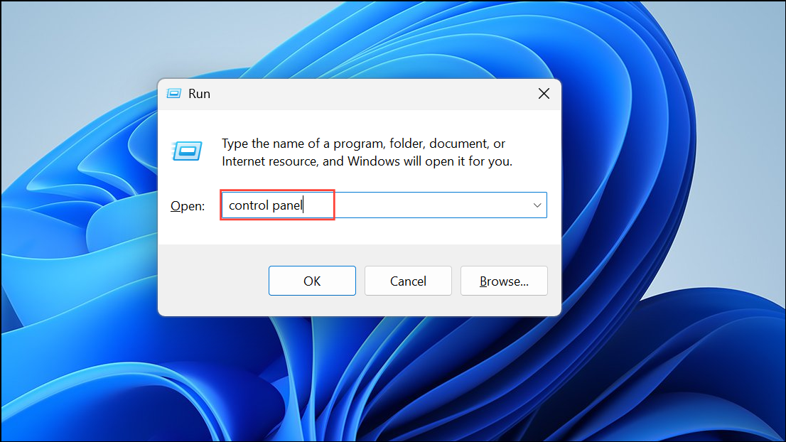 Passaggio 1:Apri la finestra di dialogo Esegui conWindows + R, tipocontrol panele premereEnter.