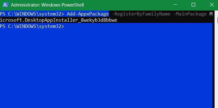 Add-AppxPackage -RegisterByFamilyName -MainPackage Microsoft.DesktopAppInstaller_8wekyb3d8bbwe