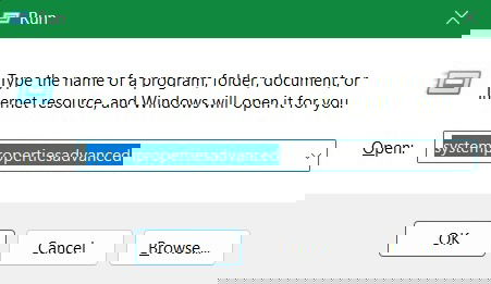Premi Win + R per visualizzare Windows Esegui, inviosystempropertiesadvancednella casella di testo efare clic su OK. Questo avvierà ilProprietà del sistemafinestra.