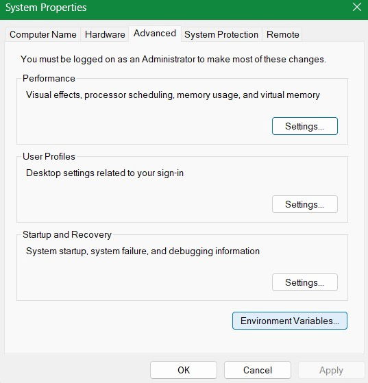Seleziona ilAvanzatoscheda, quindi fare clic suVariabili d'ambiente.