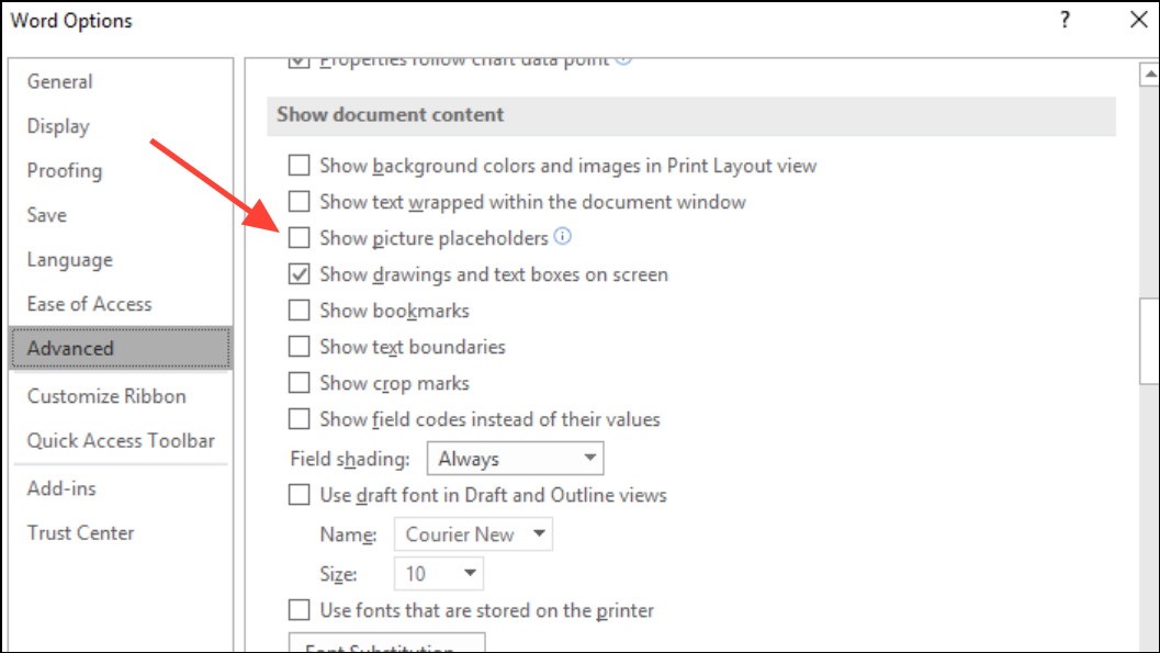 Passaggio 4:AbilitareShow picture placeholdersInOptions > Advanced > Show document contentper saltare il caricamento delle immagini durante la modifica, riducendo il ritardo.