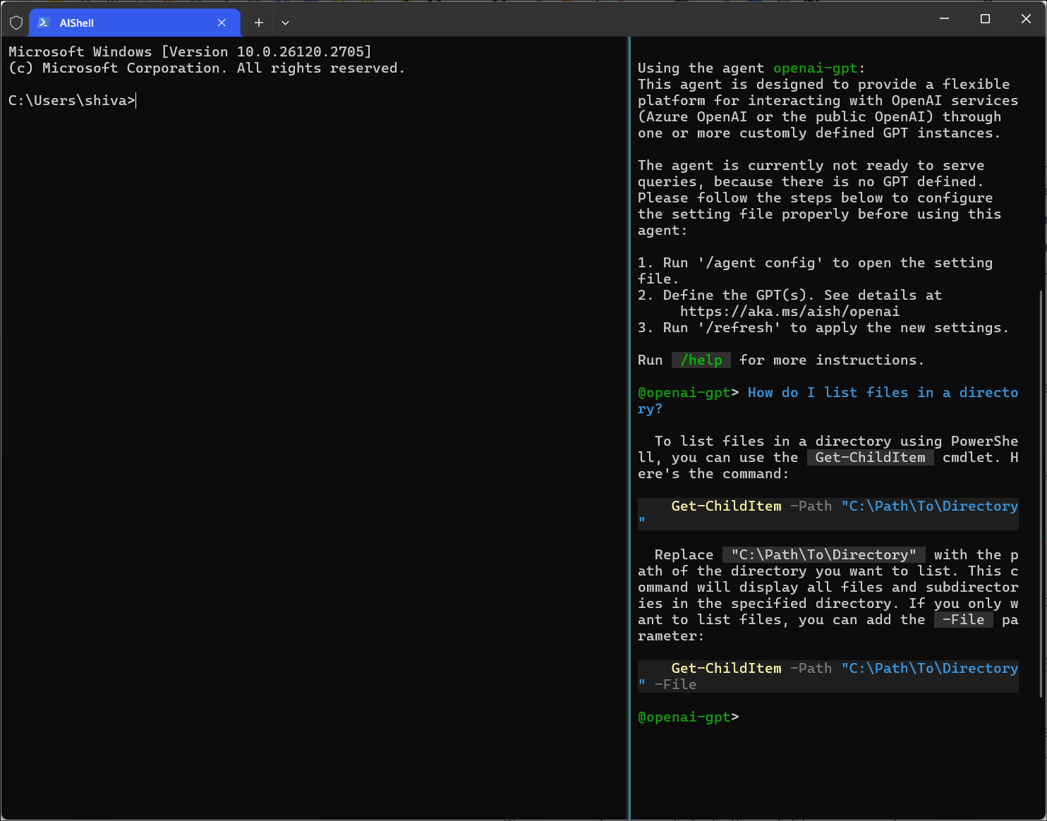 Puoi interagire con AI Shell digitando domande o comandi nel riquadro AI Shell. Per indirizzare un comando a un agente specifico, utilizzare la sintassi@<agentName>seguito dalla tua domanda. Ad esempio,@openai-gpt "How do I list files in a directory?"invierà la domanda all'agente Azure OpenAI. La selezione iniziale dell'agente verrà effettuata dal prompt quando si esegue il comandoStart-AIShell.