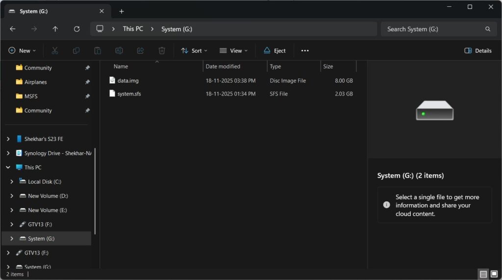 - Ci sarà un file chiamato system (system.sfs); taglia il file e incollalo nell'unità di archiviazione appena creata, che abbiamo creato tramite Gestione disco.