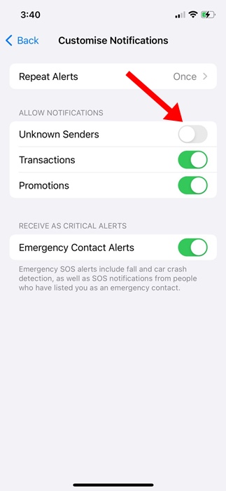 3. Disabilita notifiche per mittente sconosciuto