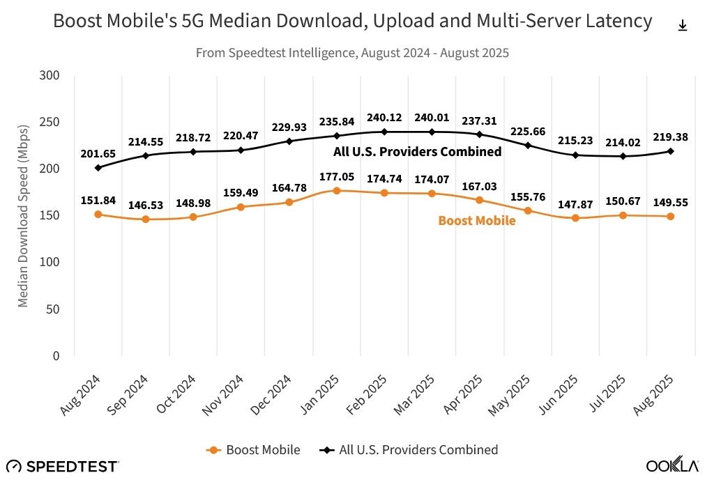 Il mese scorso, la velocità mediana dei dati di download 5G di Boost misurata da Ookla è stata di 149,55 Mbps rispetto ai 219,38 Mbps di tutti i fornitori statunitensi messi insieme. La velocità di caricamento mediana 5G di Boost il mese scorso è stata di 8,93 Mbps contro 10,81 Mbps per tutti i fornitori statunitensi messi insieme. E anche la latenza media del 5G di Boost non è riuscita a eguagliare la velocità media di tutti i fornitori statunitensi. Boost ha avuto una latenza media di 61 millisecondi (ms) rispetto a 50 (ms) per le portanti combinate.