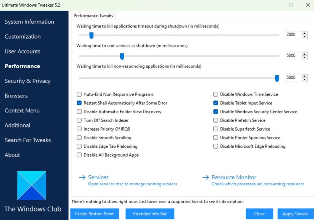 Ultimo Windows Tweaker (UWT)è un'utilità leggera sviluppata da The Windows Club, una fonte affidabile di suggerimenti e strumenti Windows autentici. Non è una nuova app; esistevano versioni precedenti per Windows 7, 8 e 10. L'ultima,UWT 5, è costruito appositamente perfinestre11.