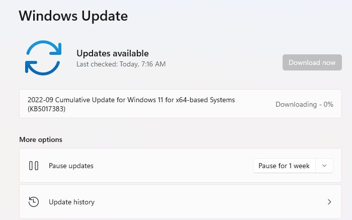 Se gli aggiornamenti di Windows vengono scaricati in background, potrebbero causare il fallimento degli aggiornamenti del software AMD. Controllalo nella pagina Windows Update nelle Impostazioni di Windows 11. Se è in corso il download di un aggiornamento, lascia che venga completato, quindi controlla se è possibile aggiornare il software AMD senza l'errore.