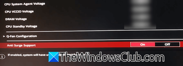 ASUS Anti-Surge è una funzione di protezione presente su alcune schede madri ASUS progettata per proteggere il sistema da un'alimentazione instabile e da sbalzi di tensione. Quando viene rilevato uno sbalzo di tensione, il computer mostra il messaggio "ASUS Anti-Surge è stato attivato per proteggere il sistema" messaggio all'avvio del sistema. Se non è possibile avviare Windows a causa di questo errore, utilizzare le seguenti soluzioni: