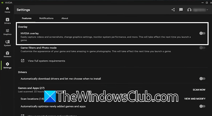 - Spegni ilSovrapposizione NVIDIAinterruttore.