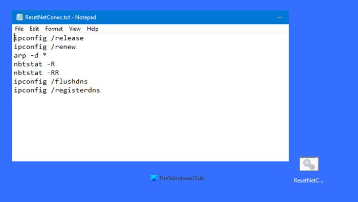Salvare il file (preferibilmente sul desktop) con un nome e aggiungere l'estensione.batestensione del file – ad es.;ResetNetConec.bat.