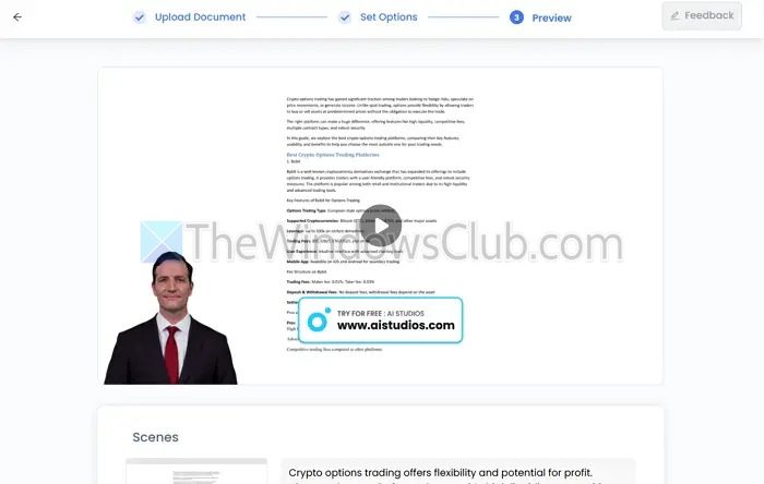 Dopo la registrazione, dovrai caricare un file PDF, Doc o PPT. Successivamente, puoi selezionare il tuo avatar parlante, la musica di sottofondo e la voce e sei pronto per generare il tuo video.