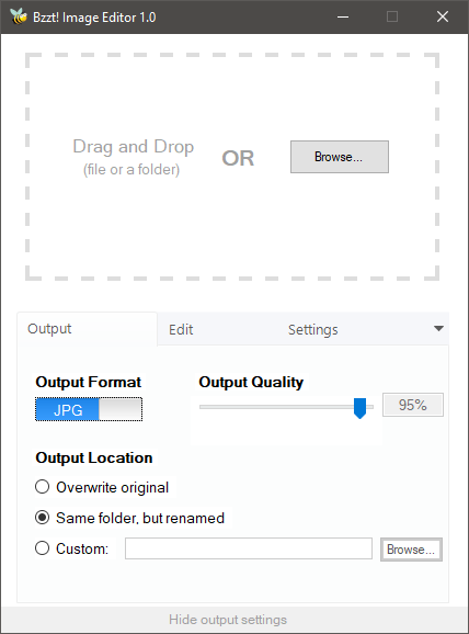 Puoi scegliere tradue formati di outpute selezionare quello desideratoqualità dell'uscitaregolando il cursore. Per impostazione predefinita, il programma sovrascriverà l'immagine originale, ma puoi anche cambiarla. La seconda opzione ti consente di salvare l'immagine nella stessa cartella ma rinominata e la terza opzione ti consente di specificare una posizione personalizzata.