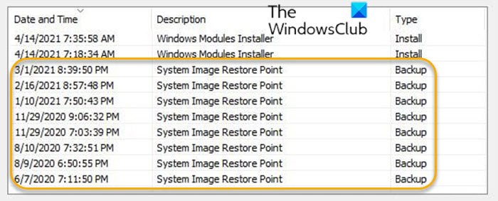 La protezione del sistema per impostazione predefinita puòche sono copie shadow locali. UNPunto di ripristino dell'immagine del sistemaè descritto come un tipo 'Backup' e non è una copia shadow – lo èMetadatiche punta all'unità contenente il backup. Questi punti di ripristino del backup rimarranno dopo aver eliminato tutti gli altri tipi di punti di ripristino. In questo post ti mostreremo come farloeliminare il punto di ripristino dell'immagine del sistema da Ripristino configurazione di sistemain Windows 11/10.