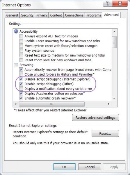 - Disattiva il debug degli script (Altro)