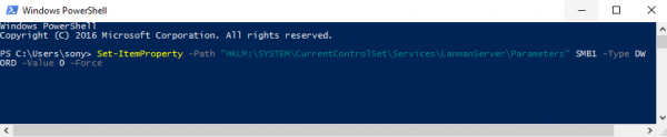 Set-ItemProperty -Path "HKLM:\SYSTEM\CurrentControlSet\Services\LanmanServer\Parameters" SMB1 -Type DWORD -Value 0 –Force