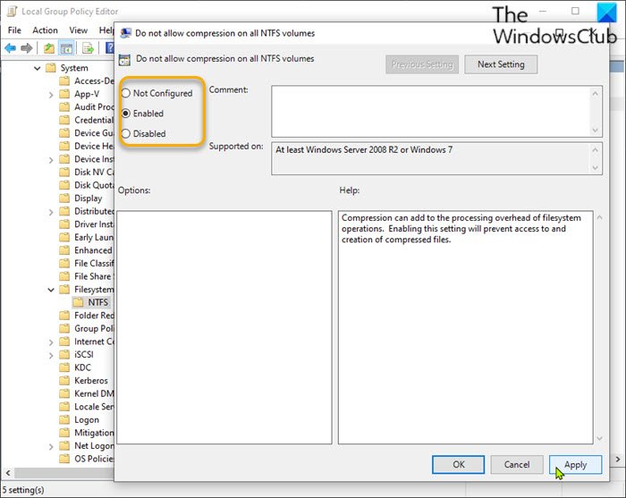 - Nella finestra della policy, imposta il pulsante di opzione suNon configuratoODisabilitato aabilitare la compressione file NTFS.