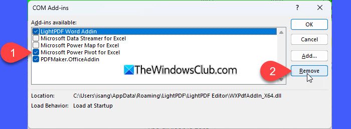 Fare clic suFilemenu e selezionareAltro > Opzioni. Seleziona ilComponenti aggiuntivischeda nella finestra Opzioni di Excel, quindi selezionareComponenti aggiuntivi COMdal menu a discesa in basso e fare clicAndare.