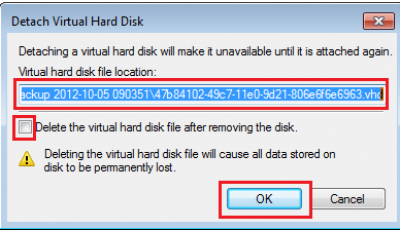 Lo scollegamento di un disco rigido virtuale lo rende non disponibile finché non viene nuovamente collegato. Conserva ilElimina il file del disco rigido virtualecasella deselezionata. Fare clic su OK ed uscire.