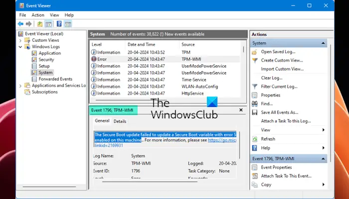 Vedi?ID evento 1796nei registri di Windows 11/10/Server? Se il processo di aggiornamento sicuro non può essere completato e fallisce con un messaggio di errore:L'aggiornamento Secure Boot non è riuscito ad aggiornare una variabile Secure Boot con l'errore Secure Boot non è abilitato su questa macchina—allora questo post ti aiuterà a risolvere il problema.