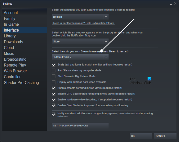 Secondo alcuni utenti, la modifica della skin predefinita del client Steam comporta un utilizzo elevato della CPU da parte del programma di avvio automatico del client Steam. Se hai modificato anche la skin predefinita del client Steam, ripristinala ai valori predefiniti e verifica se apporta modifiche.