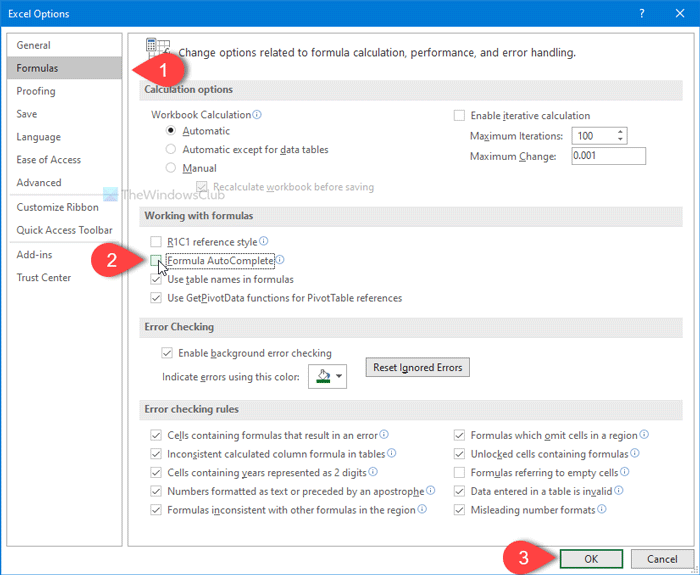 Per impostazione predefinita, sei inGeneralescheda, ma è necessario passare alla schedaFormulescheda. Successivamente, puoi vedere una casella di controllo denominataCompletamento automatico della formulache appare inLavorare con le formulesezione. È necessario rimuovere il segno di spunta dalla casella di controllo corrispondente e fare clic suOKpulsante per salvare la modifica.