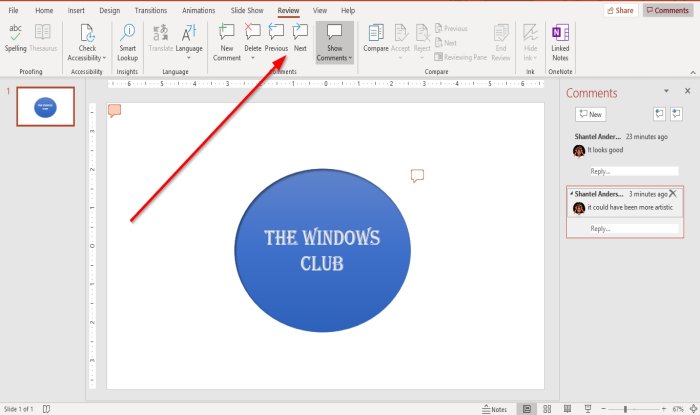 InPresa della corrente, possiamo aggiungere commenti, modificarli e apportare ulteriori modifiche. Possiamo anche spostarci tra i commenti e nasconderli ed eliminarli. I commenti vengono utilizzati quando l'utente desidera feedback dalle persone su una presentazione creata dall'utente. UNcommentoè una nota allegata a una parola o lettera su una diapositiva. Ora vediamo come fareaggiungere, modificare, mostrare, nascondere o eliminare commenti di PowerPoint.