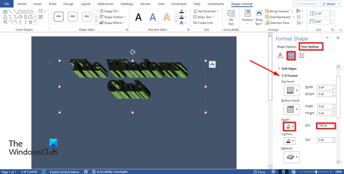 - Fare clic sulla scheda Formato forma e fare clic sul pulsante Riempimento testo per selezionare un colore senza modificare il colore della Profondità.