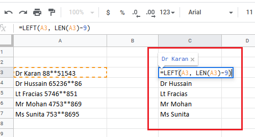 In questa formula,<First cell with full text>è la posizione della prima cella nella colonna con il testo completo.<Number of characters to be removed>sono il numero di caratteri che intendi rimuovere dal lato destro del testo.