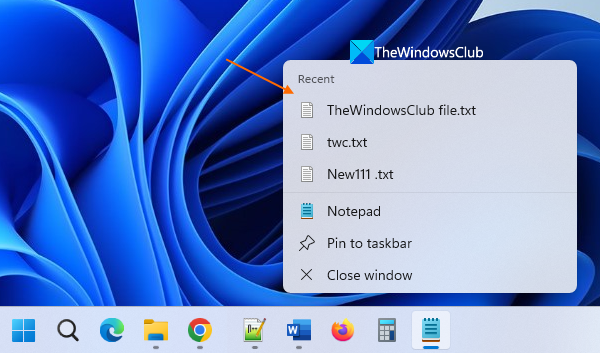 Questa opzione è utile per visualizzare separatamente un elenco di file aperti di recente per un'app specifica. Quello che devi fare è fare clic con il pulsante destro del mouse sull'icona della barra delle applicazioni di un'applicazione aperta, ad esempio Blocco note o MS Word, e aRecentesarà visibile nel menu di scelta rapida dell'app. Per ogni elemento recente in quella sezione, aAggiungi a questo elencol'opzione è visibile anche al passaggio del mouse e aiuta a mantenere l'elemento nell'elenco in modo che non venga sostituito da altri elementi se vengono aperti sempre più elementi.