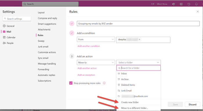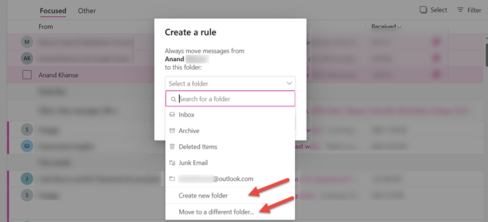 Una scorciatoia per farlo sarebbe fare clic con il pulsante destro del mouse sul thread di posta elettronica della persona specifica > Regole > Crea regola. Segui lo stesso metodo.