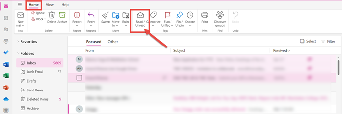 Per ordinare le email in Outlook in base a Non letti, vai aCasascheda e fare semplicemente clic suLetto/Non lettoopzione.