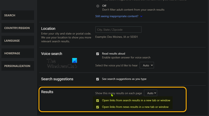 Aconfigurare le impostazioni di Bing SafeSearchquindi ogni volta che fai clic su un collegamento di ricerca o di notizie nel browser Bing sul Edge, non si aprirà in una nuova scheda del browser sul tuo dispositivo Windows, macOS o Linux, procedi come segue: