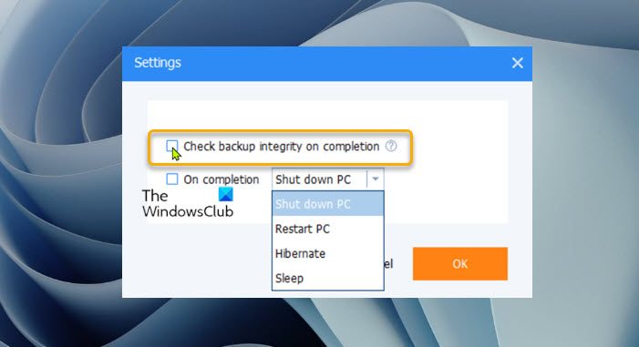 - Seleziona ilVerificare l'integrità del backup al termineopzione.