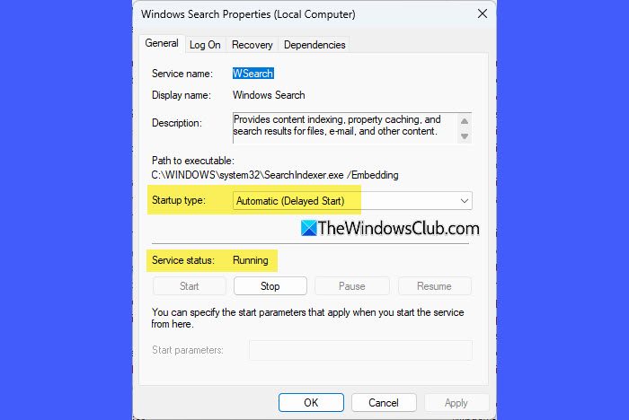 Se l'indicizzazione non è in esecuzione sul tuo PC Windows 11/10, assicurati che il servizio di ricerca di Windows (wsearch) sia configurato correttamente. AprireServizi.msc, fare clic con il pulsante destro del mouse suRicerca di Windowsservizio e selezionareProprietà. ModificaTipo di avvioAAutomatico (avvio ritardato). Se utilizzi un antivirus o uno strumento di ottimizzazione del PC, assicurati che non stia disabilitando il servizio.