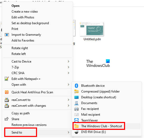 I passaggi precedenti aggiungeranno la cartella selezionata all'opzione Invia a nel menu contestuale del tasto destro. Ora puoi inviare facilmente tutti i file alla cartella utilizzando l'opzione Invia a con un solo clic.