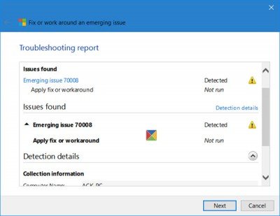Microsoft ha classificato questo problema come nuovo ed emergente 70008 e sta indagando sulle cause e sulle soluzioni. Ma fino a quando il problema non verrà risolto, Microsoft consiglia di scaricare ed eseguire questo strumento di risoluzione dei problemi.