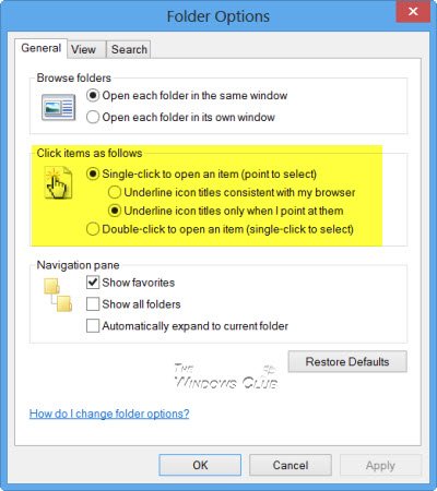1] Perché fare clic due volte per eseguire un'attività? Dimezza il numero di clic che fai nella tua vita! Apri Explorer > Visualizza > Opzioni cartella > Impostazioni >Fare clic una sola volta per aprire un elemento. Ora, dalla prossima volta, dovrai fare clic solo una volta per aprire un file o una cartella. Questa è una delle prime impostazioni che cambio dopo una nuova installazione di Windows.