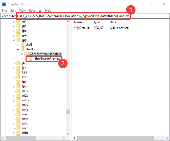 [HKEY_CLASSES_ROOT\SystemFileAssociations\.jpeg\ShellEx\ContextMenuHandlers\ShellImagePreview]
