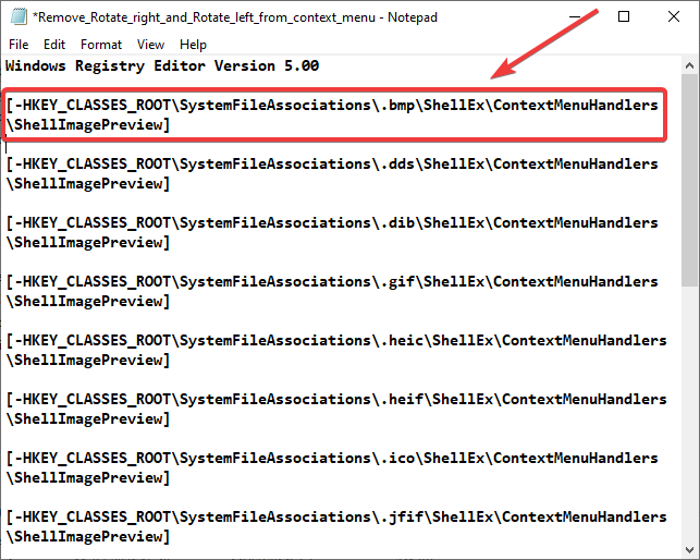 Innanzitutto, apri Blocco note sul tuo PC. Successivamente, scrivi il seguente comando per rimuovere Ruota a sinistra e Ruota a destra dal menu contestuale delle immagini BMP: