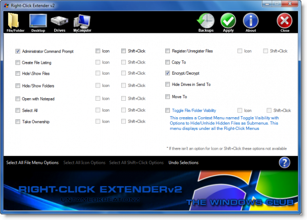 Right-Click Extender v2 aggiunge molte nuove opzioni rispetto alla versione precedente. V2 ti consente anche di aggiungere ciascun elemento al menu Nascosto visualizzabile premendo Maiusc+clic. In Impostazioni, hai la possibilità di creare un backup del registro (esegui il backup solo delle sezioni di backup del registro a cui l'applicazione apporterà modifiche) o creare un punto di ripristino del sistema prima di apportare modifiche. Facoltativamente è possibile ripristinare il backup e aprire il punto di ripristino del sistema per ripristinare le modifiche.