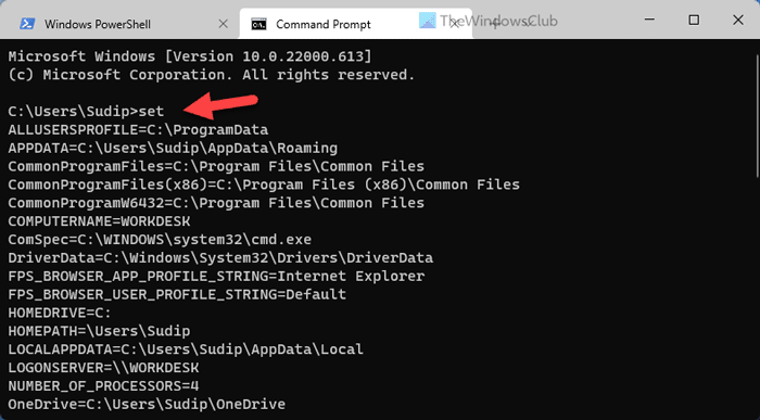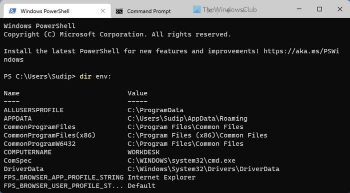 Per visualizzare le variabili d'ambiente in Windows 11, è possibile utilizzare uno dei metodi sopra menzionati. Se non desideri modificare le variabili esistenti, puoi utilizzare il metodo del prompt dei comandi. Per questo, puoi aprire il prompt dei comandi o l'istanza del prompt dei comandi nel Terminale di Windows e inserire questo comando:impostato. Quindi, mostra quasi tutto ciò che riguarda le variabili d'ambiente dell'utente corrente sullo schermo. Allo stesso modo, puoi utilizzare il metodo Windows PowerShell per ottenere la stessa cosa. In tal caso, devi usare questo comando:dir inv: