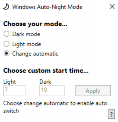 Quando esegui l'applicazione per la prima volta, vedrai una piccola finestra con alcune opzioni. Puoi selezionare il tema chiaro o quello scuro proprio come nell'app Impostazioni oppure puoi selezionareCambia automaticamenteche consentirà ilScegli l'opzione Ora di inizio personalizzata....